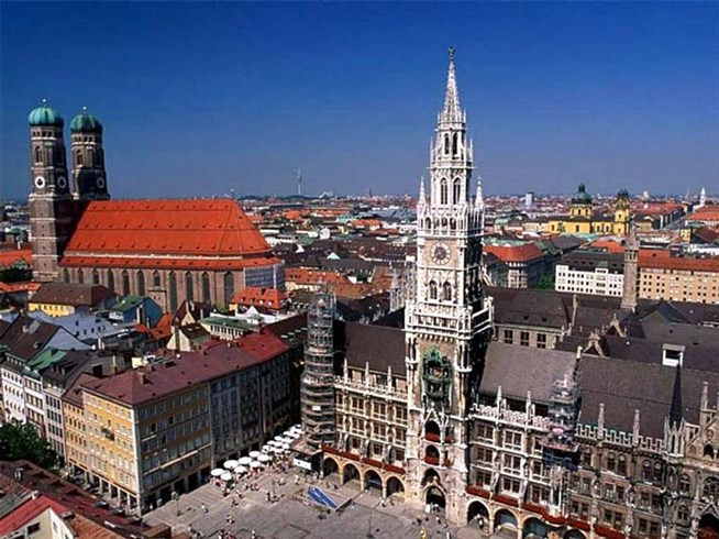 Мюнхен.Панорама площади Мариенплац. Справа: здание новой ратуши, слева: собора Богоматери.