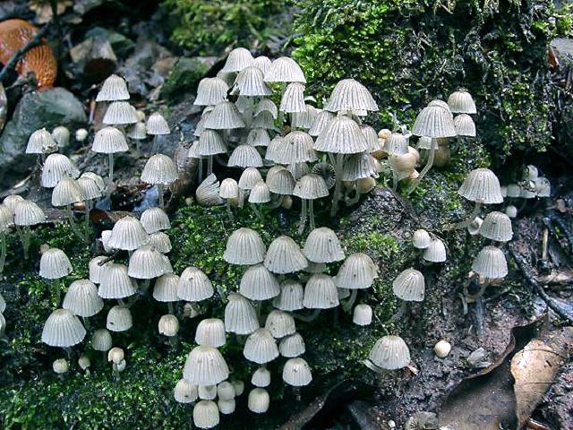 Навозник рассеянный (Coprinus disseminatus). Растет колониями, шляпка мелкая (диаметр 0, 5-1, 5 см), складчатая, колокольчатой формы.