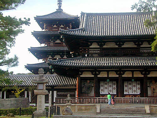 Монастырь Хорюдзи. Нара. Самым старым из сохранившихся архитектурных сооружений Японии является выстроенный в китайском стиле буддийский монастырь Хорюдзи близ Нары. Его ансамбль составляют несколько нарядных, окрашенных красным лаком и похожих друг на друга павильонов.