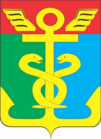 Герб города Находка, утвержденный 22 сентября 2000 года (ранее утверждался 31 июля 1997). В рассеченном лазоревом (синем, голубом) и зеленом щите с червленой (красной) главой — золотой якорь, обвитый наподобие кадуцея парой золотых змей. Вверху на красном поле — крылышки Гермеса.