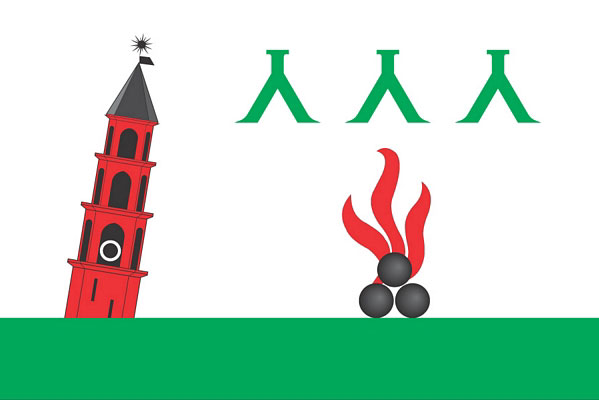 Флаг Невьянска и Невьянского района был принят 30 мая 2001 года. На белой полосе помещены красная с черными окнами и кровлей наклонная башня, пирамида из трех черных ядер с исходящим от них пламенем, сопровождаемая сверху тремя зелеными рудоискательскими лозами.