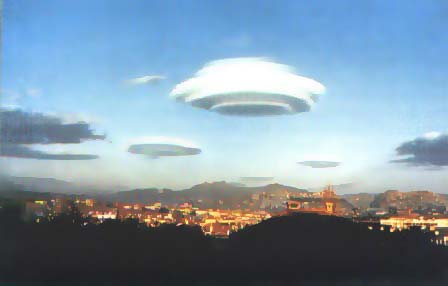 Кучевые облака редкой формы, напоминающие летающие тарелки, над городом Сантосом в Бразилии.