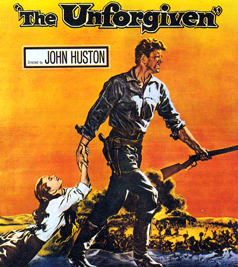 Плакат вестерна режиссера Джона Хьюстона «Непрощенная» с участием Берта Ланкастера и Одри Хепберн. В этом фильме Одри Хепберн сыграла роль индеанки, потерявшей ребенка после падения с лошади. 1960 год.