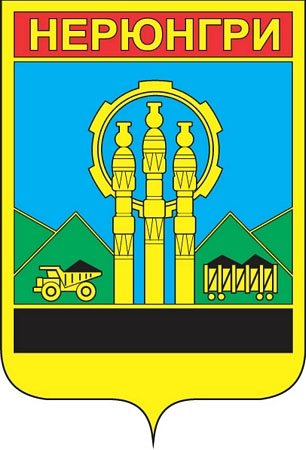 Герб Нерюнгри. 1984 год. На геральдическом щите изображены угольный пласт, самосвал, вагонетка, коновязи и шестерня над ними.