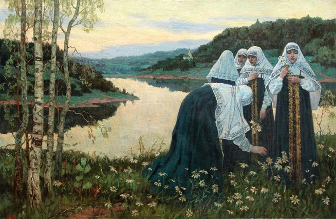 М.В. Нестеров. Послушницы на берегу реки. 1920-е годы. Холст, масло. Частное собрание.