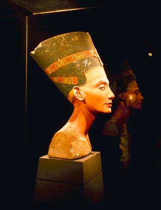 В искусстве был создан новый образ человека; в изображениях царя, царицы Нефертити и приближенных подчеркивались, главным образом, милосердие и благость, мягкая красота и одухотворенность. Скульптурный портрет Нефертити работы Тутмеса. Раскрашенный известняк. 1-я четверть 14 в. до н. э. Античное собрание Берлинских национальных музеев.