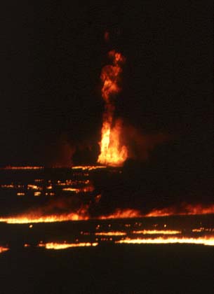 Горящая нефтяная скважина – последствия операции «Буря в пустыне». Кувейт.