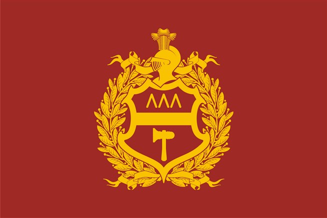 Описание: «Прямоугольное полотнище с соотношением ширины к длине 2:3 пурпурного цвета, несущее изображение обрамленного венком щитка из городского герба, выполненное желтым цветом».
