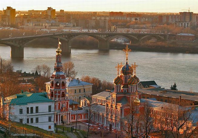 Закат над Окой. На переднем плане Рождественская (Строгановская) церковь.