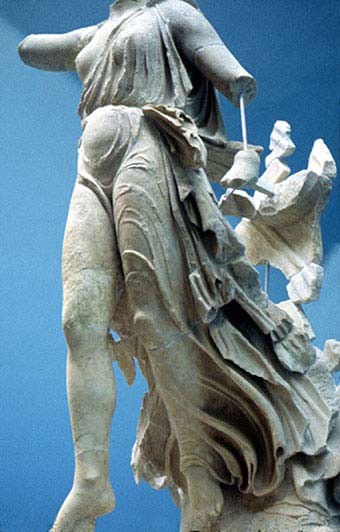 Пеоний. Статуя Ники, спускающейся с Олимпа, стоявшая перед фасадом храма Зевса в Олимпии. 5 в. до н.э. Музей в Олимпии. Греция.