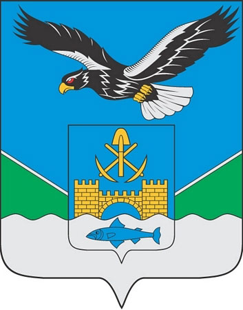 Герб Николаевска-на-Амуре и Николаевского района, принятый 4 декабря 2001 года. В лазоревом (синем, голубом) поле над серебряной волнистой оконечностью — два расходящихся зеленых горных склона, тонко окаймленные серебром. Вверху летящий черный орел с червлеными (красными) глазами, золотыми клювом и лапами, серебряными плечами и хвостом. В центральном щите на волнистой серебряной оконечности лазоревая рыба, над ней золотая стена с двумя круглыми башнями и открытыми воротами, вверху две скрещенные золотые кирки; поверх кирок — золотая лопата рукоятью вниз.