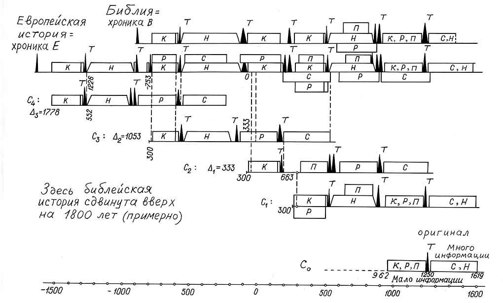Разложение хронологии Скалигера-Петавиуса в сумму трех основных сдвигов. Римская и библейская история по версии Скалигера-Петавиуса представляется в виде наложения четырех искаженных повторов одной и той же хроники 14-16 веков, искусственно сдвинутых в прошлое. Результат получен А.Т.Фоменко в 1974-1980 гг. .