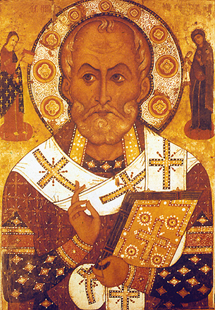 Новгородская иконописная школа. Икона Николая Чудотворца из Липенского монастыря в Новгороде. Икона написана в 1297 году Алексеем Петровым. Редчайший случай для древнерусского искусства, когда работа была датирована и подписана мастером.