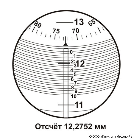 Спиральный нониус. В поле зрения видны штрихи основной миллиметровой шкалы (11, 12, 13), один из которых находится в зоне десяти делений малой шкалы; часть круговой шкалы из 100 делений и двух эквидистантных архимедовых спиралей. При отсчете деление миллиметровой шкалы должно находиться строго посередине между двумя рядом идущими спиралями. Отсчет производится последовательно по всем трем шкалам.