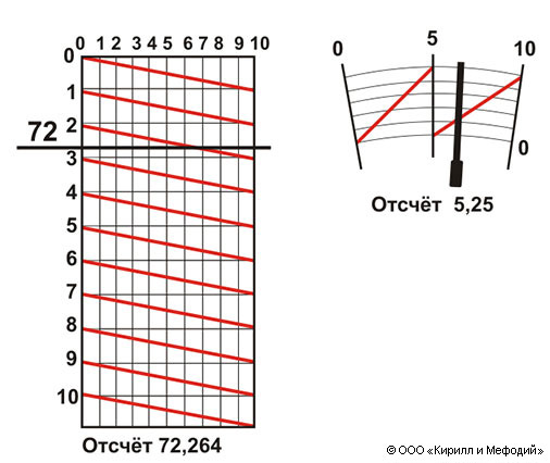 Трансверсальный нониус: слева — линейный (поперечный масштаб); деление основной шкалы (72) пересекает одну из диагоналей нониуса, отсчет производится по положению точки пересечения штриха и диагонали; справа — угломерный; принцип отсчета аналогичен.