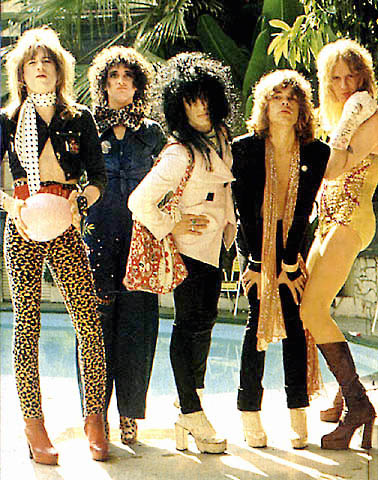 Участники группы New York Dolls появлялись на сцене в экстравагантных, двусмысленных нарядах и пользовались женской косметикой.