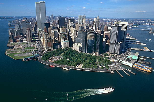 Манхэттен. Южная оконечность. С запада омывается водами реки Гудзон, с востока — Ист-ривер. Слева: небоскребы-близнецы — 110-этажные башни Центра международной торговли (1971-1973, разрушены 11 сентября 2001); справа, на заднем плане — Бруклинский мост.