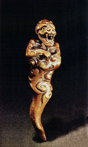 Главное назначение миниатюрной японской скульптуры нэцкэ — выполнять роль брелка-подвески. С помощью нэцкэ к поясу кимоно прикреплялись кошельки, кисеты, коробочки для парфюмерии или лекарств. Эти произведения мелкой пластики изготавливались из дерева или слоновой кости, тщательно шлифовались и полировались. Лучшие произведения отличают изысканность форм, лаконизм и утончённость исполнения. Нэцкэ. Сюмэмару Ундзюдо. Бог ветра Футэн. Дерево. Эрмитаж, Санкт-Петербург.