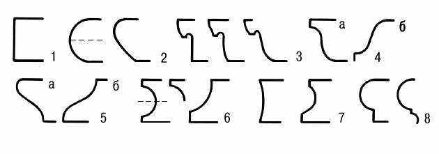 Классические греческие архитектурные обломы: 1 — полка (иначе — полочка, плинт, плита); 2 — валик, или вал (торус), и четвертной вал (до пунктира); 3 — дорический «ястребиный клюв» (слезник) и этапы его развития; 4 — дорическая кима (киматий), или гусек (а — прямой, б — обратный); 5 — ионический «лейсбийский киматий», или каблучок (а — прямой, б — обратный); 6 — выкружка; 7 — скоция; 8 — астрагал.