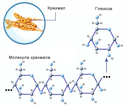 Полисахарид крахмал, содержащийся в злаках, картофеле и других продуктах, расщепляется ферментами пищеварительного тракта до мономеров - глюкозы.