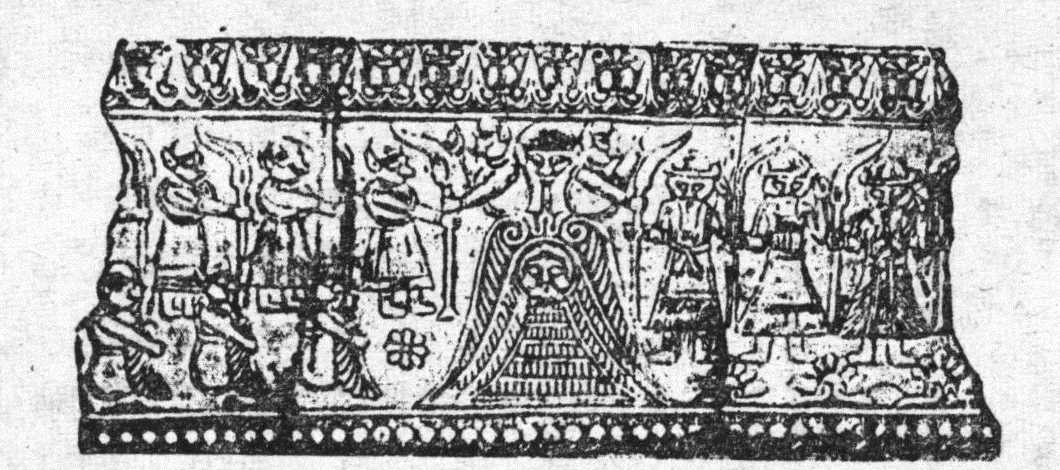 Бронзовая пластина из Луристана. В середине крылатое божество с двумя лицами: мужское лицо наверху и женское на груди. Два маленьких человека, по-видимому, выходят из его плеч. Их можно интерпретировать как близнецов. Слева три юноши (внизу) и три зрелых мужчины (наверху), справа три старика. Можно заключить, что фигура в центре представляет божество эпохи человечества, Бога Времени. Бронзовая пластинка может быть понята как иллюстрация, поясняющая дозороастрийский миф о близнецах (фотография Музея искусств Цинциннати)