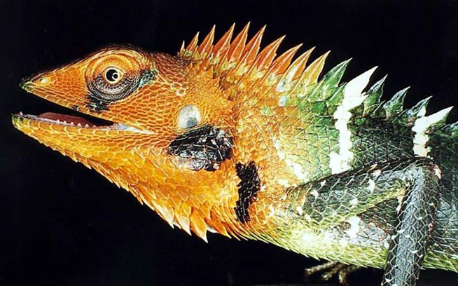 Обыкновенный калот (Calotes calotes) — один из самых крупных видов семейства агам (до 65 см). Он встречается в Южной Индии и на Цейлоне. Фотография В. В. Климова.