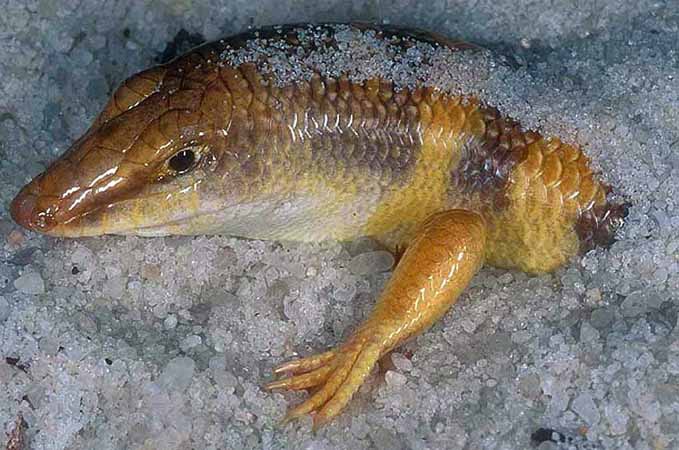 Самец обыкновенного сцинка, выкапывающийся из песка.