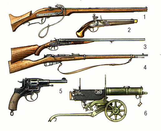 Огнестрельное оружие: 1 — фитильный мушкет 16-17 вв.; 2 — русский кавалерийский пистолет образца 1810; 3 — охотничье курковое ружье начала 20 в.; 4 — трехлинейная магазинная винтовка системы Мосина образца 1891; 5 — револьвер системы Нагана образца 1895; 6 — станковый пулемет системы Максима образца 1910.