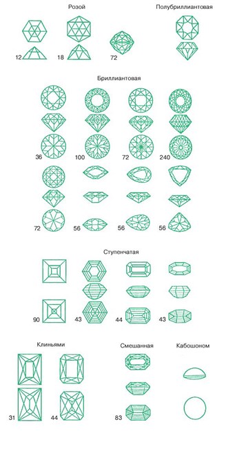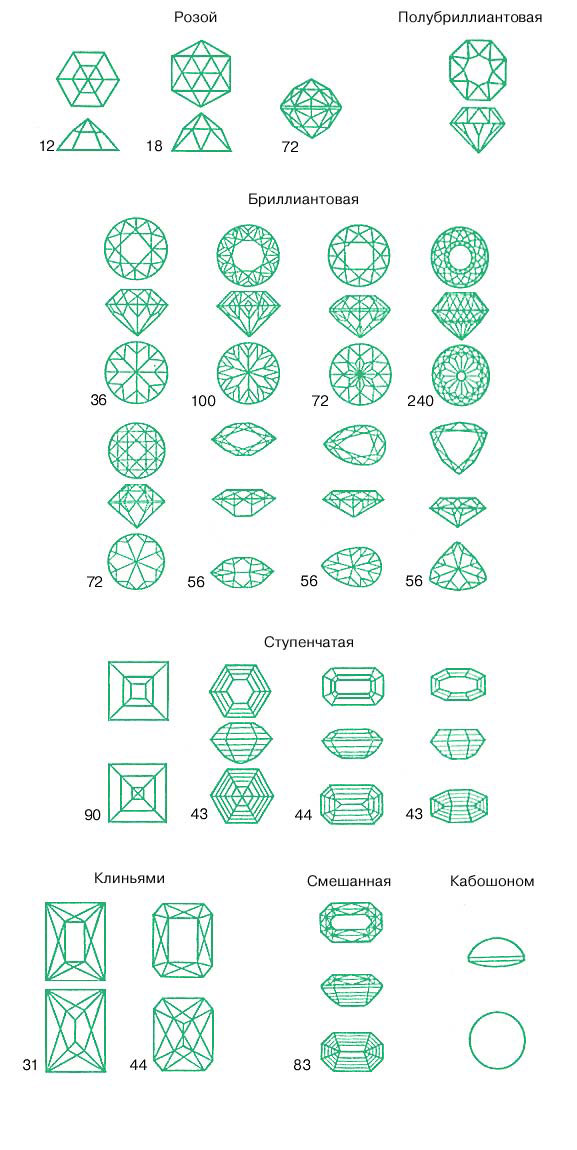 Виды и формы огранки самоцветов. Цифрами обозначено количество граней.