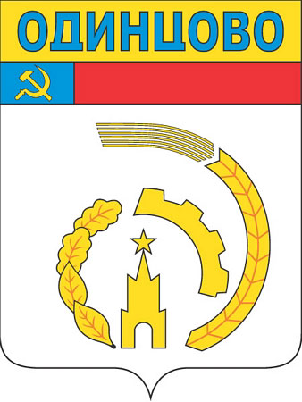 Герб города Одинцово, принятый 21 июня 1985 года. В серебряном щите золотая башня со звездой, окруженная золотыми фрагментом зубчатого колеса, дубовыми и березовыми листьями, колосом. В главе щита на золотом поле наименование города лазуревыми литерами, ниже — стилизованное изображение флага РСФСР.