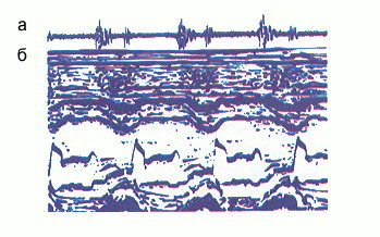 Одновременная регистрация (а) фоно- и (б) эхокардиограмм.