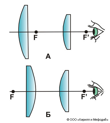 Двухлинзовые положительные окуляры: а — окуляр Гюйгенса; б — окуляр Рамсдена.