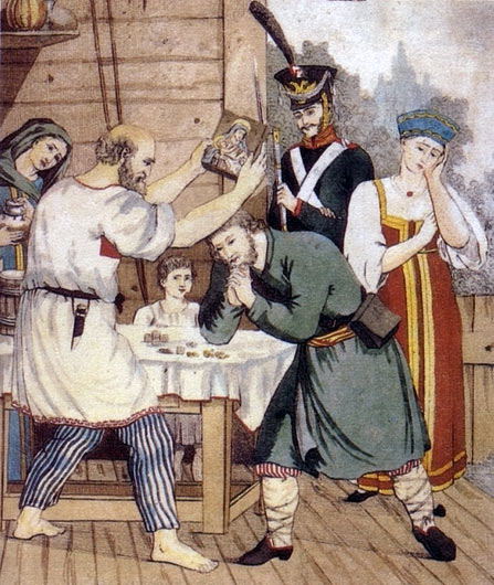 Проводы ополченца. Гравюра А. Ухтомского по оригиналу И. Лучанинова. 1812.