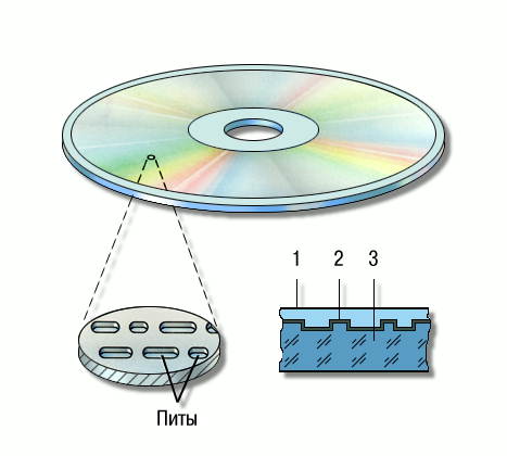 Схема конструкции оптического видеодиска: 1 — наружный слой из прозрачной пластмассы; 2 — металлизированная отражающая дорожка записи; 3 — твердая непрозрачная пластиковая основа.