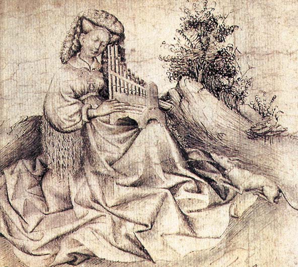Дама, играющая на органе. Рисунок пером и коричневой тушью. Нидерланды. Около 1420.