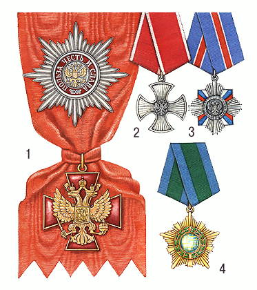Ордена в Российской Федерации (1995): 1 — звезда, лента и знак ордена «За заслуги перед Отечеством» 1 степени; 2 — орден Мужества; 3 — орден «За военные заслуги»; 4 — орден Дружбы.