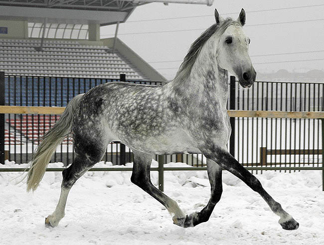 Серый в яблоках орловец, бегущий рысью.