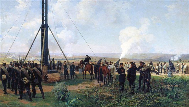 Николай Дмитриевич Дмитриев-Оренбургский (1837-1898). Артиллерийский бой под Плевной. Батарея осадных орудий на Великокняжеской горе. 1880 год. Холст, масло. Центральный военно-исторический музей артиллерии, инженерных войск и войск связи.