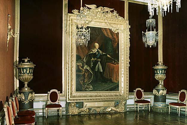 Пунцовая гостиная Останкинского дворца. Получила название от пунцового штофа, которым обиты стены. На правой стене — парадный портрет императора Павла I, написанный крепостным живописцем И. П. Аргуновым. Портрет помещен в уникальную позолоченную деревянную раму, выполненную крепостными резчиками.