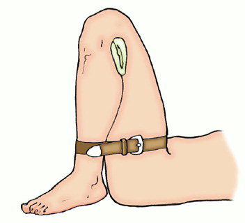 Остановка кровотечения в области голени путем максимального сгибания коленного сустава.