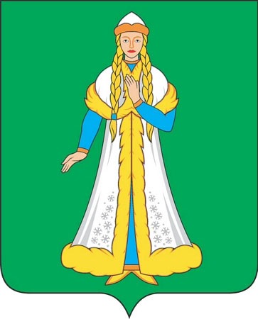 Герб Островского района Костромской области был принят 4 июня 2003 года. В зеленом поле серебряная дева (снегурочка) с золотыми волосами, заплетенными в две косы с лазоревыми лентами в серебряной с золотым меховым отворотом шапке и в серебряной шубе без рукавов с золотыми отворотами поверх лазоревого платья.