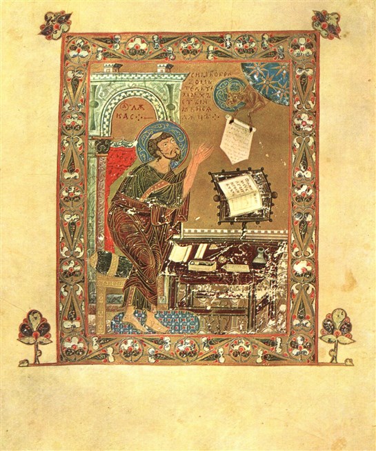 Евангелист Лука. Миниатюра византийского типа из «Остромирова Евангелия» 1056 - 1957 годов.