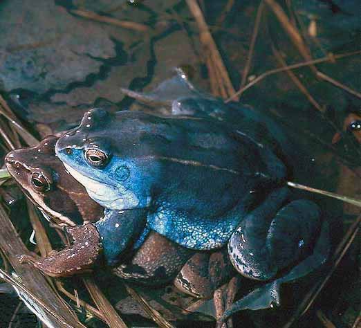 Пара остромордых лягушек. На самце серебристо-голубой «брачный наряд».