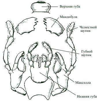 В состав грызущего ротового аппарата насекомых входят непарная верхняя губа, парные верхние и нижние челюсти, непарная нижняя губа, а также парные губные и челюстные щупики.