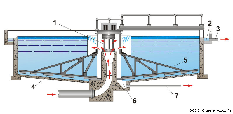 Радиальный отстойник: 1 — центральная распределительная труба; 2 — круговой желоб; 3 — труба; 4 — скребки; 5 — движущаяся ферма; 6 — приямок; 7 — иловая труба.