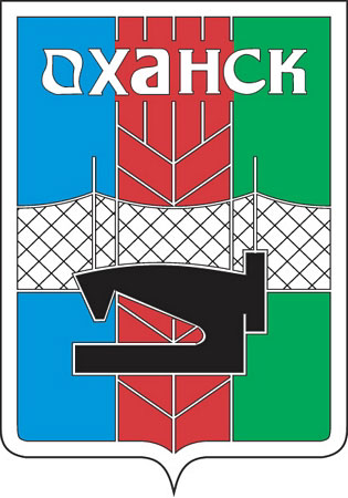Герб Оханска, принятый 29 мая 1980 года. Геральдический щит рассечён на три поля: голубое, зеленое и центральное — оранжевое, на котором изображен хлебный колос. Рыболовная сеть и швейная машинка изображены в центре композиции.