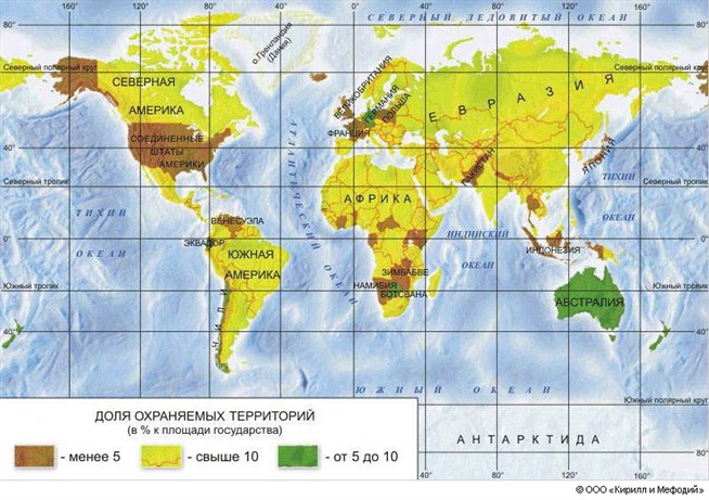 Доля охраняемых территорий в разных странах мира. Географическая карта.