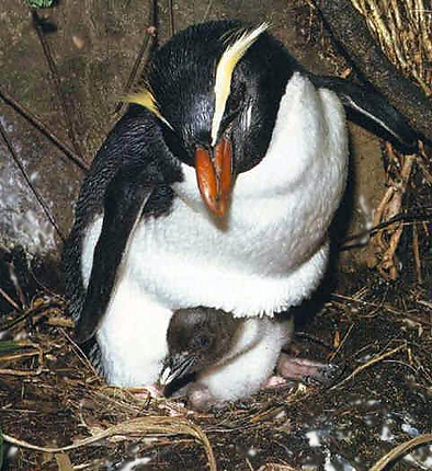 Самец пингвина Виктории не только высиживает яйца, но и оберегает птенцов во время их развития.