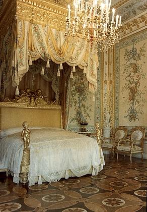 Павловск. Парадная спальня (1792 и 1803-1804 годы, архитекторы В. Бренна, А. Воронихин), служила декоративным интерьером, не имевшим бытового назначения. Резная золоченая кровать изготовлена французким мастером А. Жакобом в 1782-1783 годах.