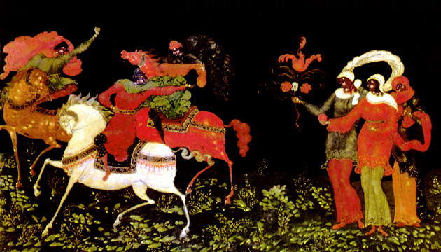 Палехская миниатюра («Девушки, провожающие всадников»)